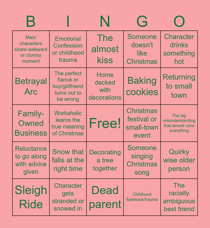 This bingo card has a free space and 25 words: Snow that falls at the right time, Dead parent, Home decked with decorations, Sleigh Ride, Character drinks something hot, Main characters share awkward or clumsy moment, Betrayal Arc, Emotional Confession or childhood trauma, Christmas festival or small-town event, Decorating a tree together, Baking cookies, Family-Owned Business, Someone singing Christmas song, Quirky wise older person, The perfect fiancé or boy/girlfriend turns out to be wrong, The grand romantic gesture, The big misunderstanding that almost ruins everything, The almost kiss, Returning to small town, Workaholic learns the true meaning of Christmas, The racially ambiguous best friend, Character gets stranded or snowed in, Reluctance to go along with advice given, Someone doesn't like Christmas and Childhood flashback/trauma.