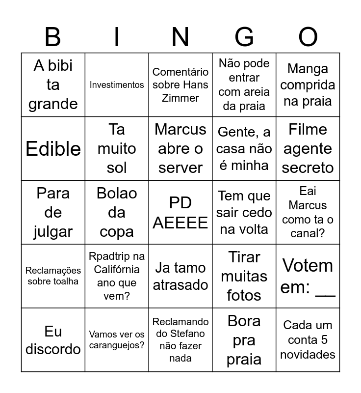 This bingo card has a free space and 24 words: Rpadtrip na Califórnia ano que vem?, Vamos ver os caranguejos?, Marcus abre o server, Eu discordo, Manga comprida na praia, A bibi ta grande, Edible, Investimentos, Tem que sair cedo na volta, Ja tamo atrasado, Gente, a casa não é minha, Para de julgar, Tirar muitas fotos, Votem em: __, Ta muito sol, Bora pra praia, Eai Marcus como ta o canal?, Comentário sobre Hans Zimmer, Filme agente secreto, Bolao da copa, Cada um conta 5 novidades, Reclamações sobre toalha, Não pode entrar com areia da praia and Reclamando do Stefano não fazer nada.