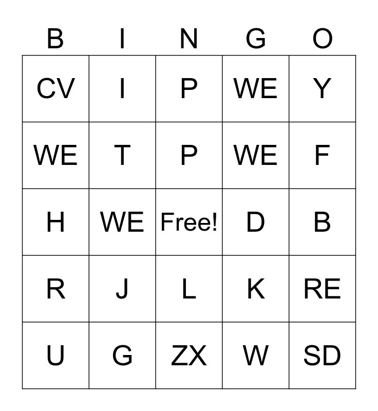 This bingo card has a free space and 34 words: Q, W, W, E, R, T, Y, U, I, O, P, P, A, S, D, F, G, H, J, K, L, Z, CV, B, ZX, SD, WE, WE, WE, WE, WE, WE, RE and RE.
