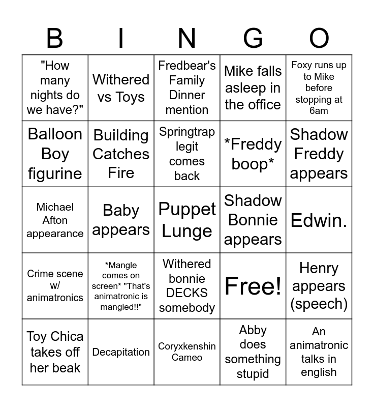 This bingo card has 25 words: *Mangle comes on screen* "That's animatronic is mangled!!", Coryxkenshin Cameo, Springtrap legit comes back, Toy Chica takes off her beak, Foxy runs up to Mike before stopping at 6am, "How many nights do we have?", Balloon Boy figurine, Withered vs Toys, Shadow Bonnie appears, Withered bonnie DECKS somebody, *Freddy boop*, Michael Afton appearance, Free!, Henry appears (speech), Building Catches Fire, An animatronic talks in english, Edwin., Fredbear's Family Dinner mention, Shadow Freddy appears, Baby appears, Puppet Lunge, Decapitation, Crime scene w/ animatronics, Mike falls asleep in the office and Abby does something stupid.