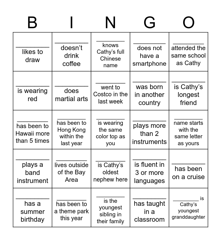 This bingo card has 57 words: _________ enjoys watching crime dramas, _________ has a summer birthday, _________ plays golf, _________ likes to draw, _________ is the youngest sibling in their family, _________ took a nap today, _________ does martial arts, _________ is an ivy-league graduate, _________ was born in another country, _________ knows what “skibidi” means, _________ does not have a smartphone, _________ has not finished Christmas shopping, _________ plays pickleball, _________ has seen K-Pop Demon Hunters, _________ arrived late to the party, _________ is born in year of the monkey, _________ attended the same school as Cathy, _________ has been to Hong Kong within the last year, _________ first name begins with the letter “C”, _________ is wearing the same color top as you, _________ plays more than 2 instruments, _________ has never eaten at this restaurant before, _________ is fluent in 3 or more languages, _________ knows Cathy’s full Chinese name, _________ is wearing earrings, _________ went to Costco in the last week, _________ is left-handed, _________ has traveled to 4 or more continents, _________ is Cathy’s longest friend, _________ has birthday in the same month as Cathy, _________ traveled the farthest to get here, _________ can solve a Rubik’s Cube, _________ has a pet cat, _________ has a sister, _________ name starts with the same letter as yours, _________ is wearing red, _________ is wearing glasses, _________ has been to Hawaii more than 5 times, _________’s favorite color is the same as Cathy’s, _________ plays a band instrument, _________ doesn’t drink coffee, _________ is Cathy’s oldest nephew here, _________ is Cathy’s youngest granddaughter, _________ drives a white car, _________ is wearing contact lenses, _________ has ran in a 5K, _________ lives outside of the Bay Area, _________ has been to a theme park this year, _________ is wearing braces, _________ supported a charity this month, _________ is wearing a regular watch (not a smartwatch), _________ has taught in a classroom, _________ enjoys gardening, _________ plays the piano, _________ has a Pokémon card collection, _________ has been on a cruise and _________ likes to sing karaoke.
