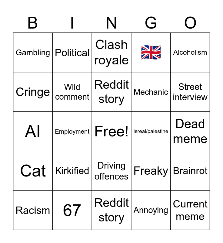 This bingo card has a free space and 24 words: Kirkified, 67, Reddit story, Racism, Alcoholism, Gambling, Cringe, Political, Isreal/palestine, Driving offences, Mechanic, AI, Freaky, Brainrot, Wild comment, Annoying, Dead meme, Clash royale, Street interview, Employment, Current meme, Cat, 🇬🇧 and Reddit story.
