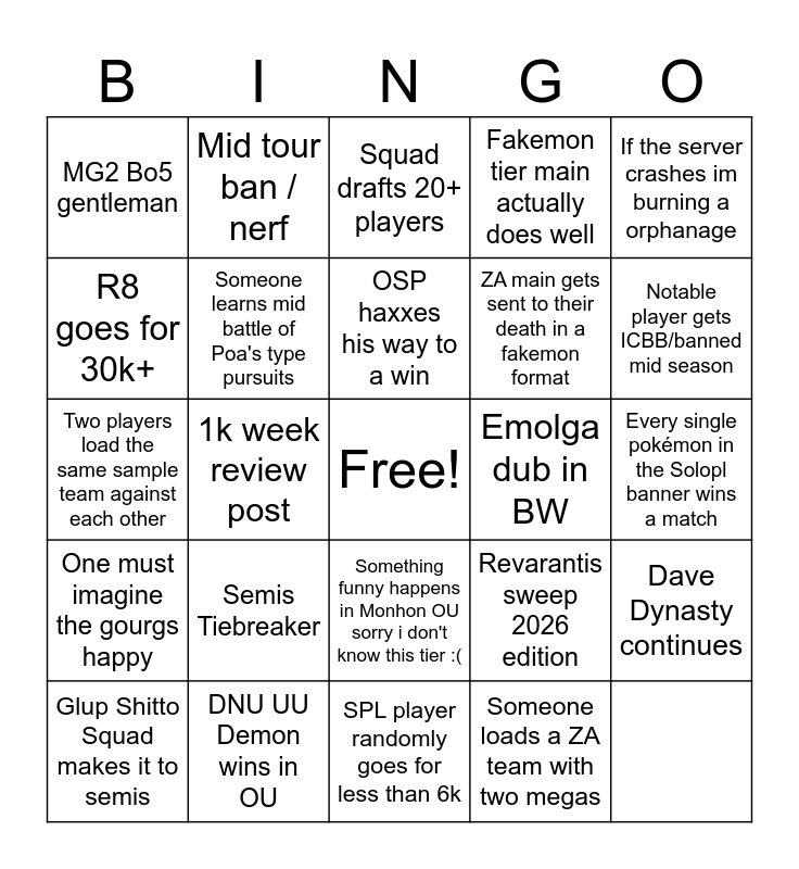 This bingo card has a free space and 24 words: One must imagine the gourgs happy, DNU UU Demon wins in OU, Something funny happens in Monhon OU sorry i don't know this tier :(, Revarantis sweep 2026 edition, If the server crashes im burning a orphanage, MG2 Bo5 gentleman, Mid tour ban / nerf, Squad drafts 20+ players, ZA main gets sent to their death in a fakemon format, Dave Dynasty continues, R8 goes for 30k+, Someone learns mid battle of Poa's type pursuits, Weeb goes 5-x in touhoumons, Emolga dub in BW, Notable player gets ICBB/banned mid season, Glup Shitto Squad makes it to semis, 1k week review post, OSP haxxes his way to a win, Fakemon tier main actually does well, Every single pokémon in the Solopl banner wins a match, Two players load the same sample team against each other, Semis Tiebreaker, SPL player randomly goes for less than 6k and Someone loads a ZA team with two megas.