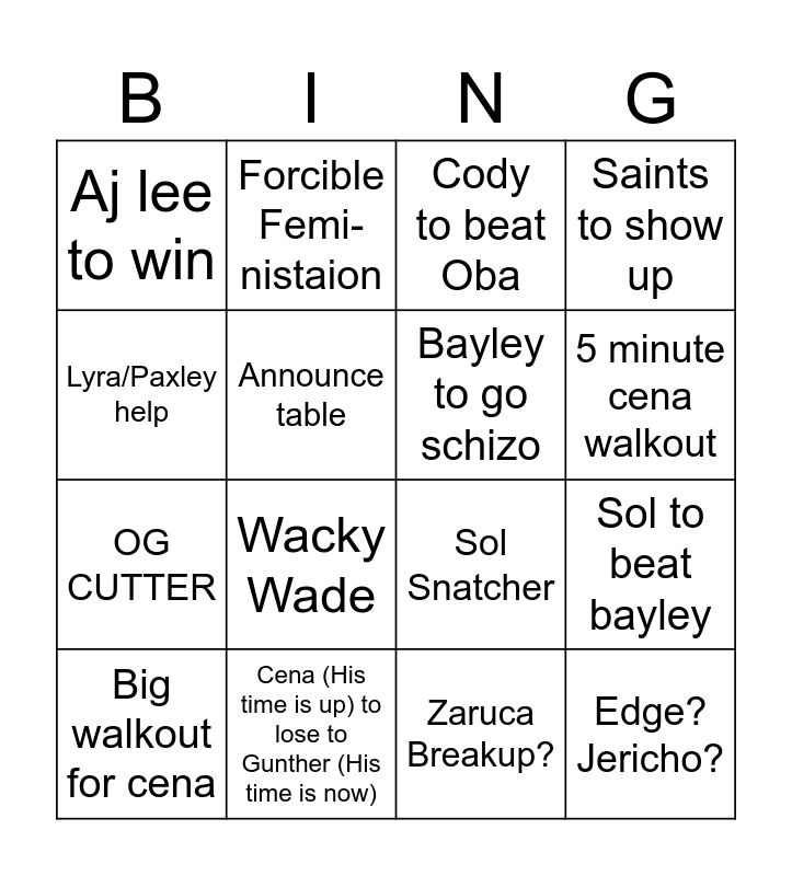 This bingo card has 16 words: Cena (His time is up) to lose to Gunther (His time is now), Sol to beat bayley, Cody to beat Oba, Aj lee to win, OG CUTTER, Forcible Femi-nistaion, Sol Snatcher, Zaruca Breakup?, Lyra/Paxley help, Announce table, Big walkout for cena, Saints to show up, Wacky Wade, 5 minute cena walkout, Bayley to go schizo and Edge? Jericho?.