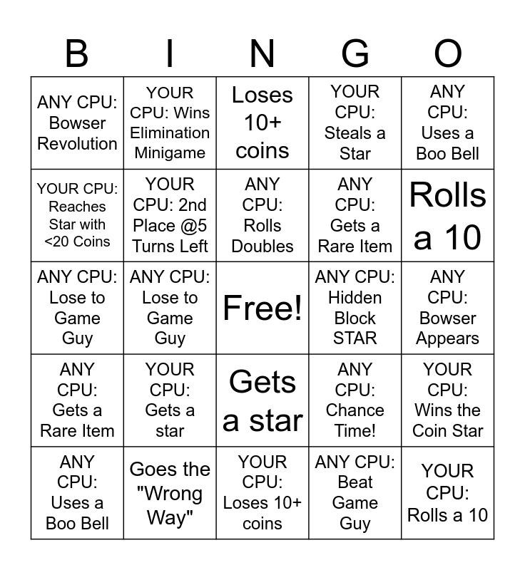 This bingo card has a free space and 50 words: YOUR CPU: Happening space, YOUR CPU: Rolls a 10, YOUR CPU: Bank Space, YOUR CPU: Loses 10+ coins, YOUR CPU: Gets a star, YOUR CPU: Wins a duel, YOUR CPU: Wins Elimination Minigame, YOUR CPU: 1st Out in Battle Minigame, YOUR CPU: Reaches Star with <20 Coins, YOUR CPU: Goes the "Wrong Way", YOUR CPU: 2nd Place @5 Turns Left, YOUR CPU: Steals a Star, YOUR CPU: Wins the Coin Star, ANY CPU: Chance Time!, ANY CPU: Bowser Appears, ANY CPU: Hidden Block Found, ANY CPU: Rolls Doubles, ANY CPU: Hidden Block STAR, ANY CPU: Uses Reverse Mushroom on Self, ANY CPU: Uses a Boo Bell, ANY CPU: Lose to Game Guy, ANY CPU: Beat Game Guy, ANY CPU: Bowser Revolution, ANY CPU: Gets a Rare Item, ANY CPU: Transported to start, Happening space, Rolls a 10, Bank Space, Loses 10+ coins, Gets a star, Wins a duel, Wins Elimination Minigame, 1st Out in Battle Minigame, Reaches Star with <20 Coins, Goes the "Wrong Way", 2nd Place @ 5 Turns Left, Steals a Star, Wins the Coin Star, ANY CPU: Chance Time!, ANY CPU: Bowser Appears, ANY CPU: Hidden Block Found, ANY CPU: Rolls Doubles, ANY CPU: Hidden Block STAR, ANY CPU: Uses Reverse Mushroom on Self, ANY CPU: Uses a Boo Bell, ANY CPU: Lose to Game Guy, ANY CPU: Beat Game Guy, ANY CPU: Bowser Revolution, ANY CPU: Gets a Rare Item and ANY CPU: Transported to start.