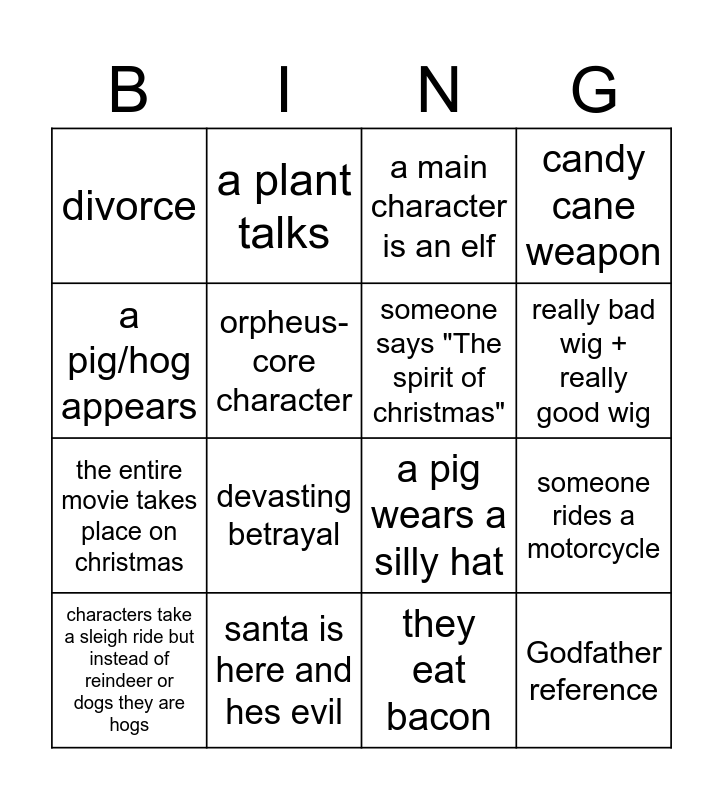 This bingo card has 16 words: santa is here and hes evil, someone rides a motorcycle, a main character is an elf, divorce, the entire movie takes place on christmas, a plant talks, a pig wears a silly hat, they eat bacon, a pig/hog appears, orpheus-core character, characters take a sleigh ride but instead of reindeer or dogs they are hogs, candy cane weapon, devasting betrayal, really bad wig + really good wig, someone says "The spirit of christmas" and Godfather reference.