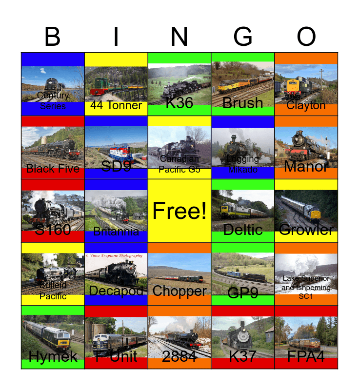 This bingo card has 24 images, a free space and 24 words: Decapod, F Unit, Canadian Pacific G5, Hymek, Clayton, Century Series, Black Five, 44 Tonner, Deltic, Chopper, Logging Mikado, S160, GP9, Lake Superior and Ishpeming SC1, SD9, K37, Growler, K36, Manor, Britannia, FPA4, Bulleid Pacific, Brush and 2884.