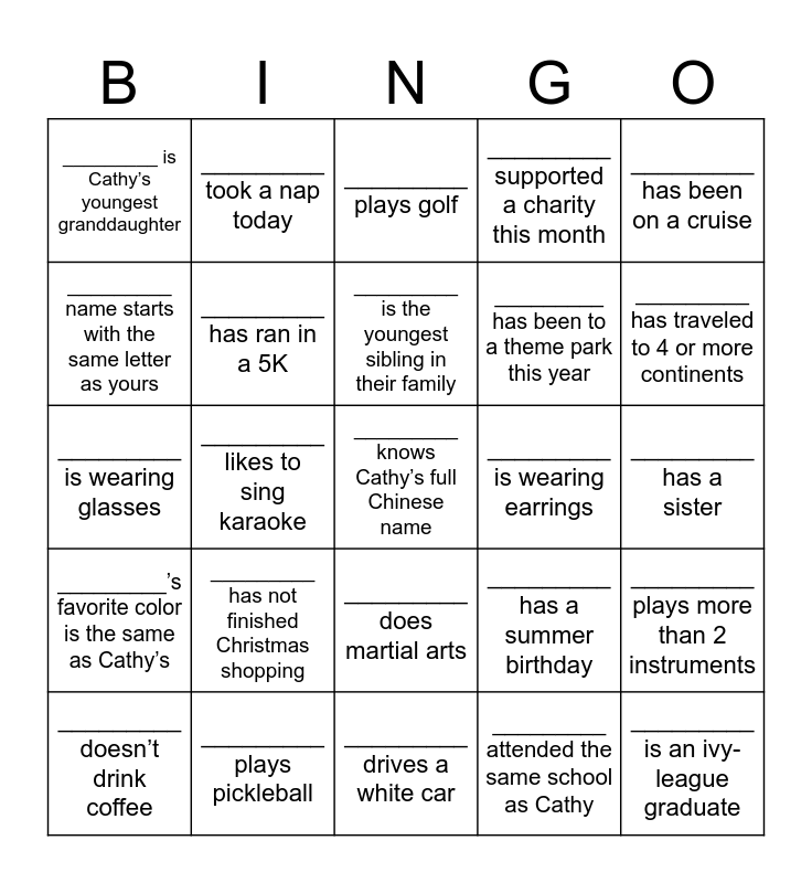 This bingo card has 57 words: _________ plays a band instrument, _________ doesn’t drink coffee, _________ is Cathy’s oldest nephew here, _________ is Cathy’s youngest granddaughter, _________ drives a white car, _________ is wearing contact lenses, _________ has ran in a 5K, _________ lives outside of the Bay Area, _________ has been to a theme park this year, _________ is wearing braces, _________ supported a charity this month, _________ is wearing a regular watch (not a smartwatch), _________ has taught in a classroom, _________ enjoys gardening, _________ plays the piano, _________ has a Pokémon card collection, _________ has been on a cruise, _________ likes to sing karaoke, _________ is fluent in 3 or more languages, _________ knows Cathy’s full Chinese name, _________ is wearing earrings, _________ enjoys watching crime dramas, _________ has a summer birthday, _________ plays golf, _________ likes to draw, _________ is the youngest sibling in their family, _________ went to Costco in the last week, _________ is left-handed, _________ has traveled to 4 or more continents, _________ is Cathy’s longest friend, _________ has birthday in the same month as Cathy, _________ traveled the farthest to get here, _________ can solve a Rubik’s Cube, _________ has a pet cat, _________ has a sister, _________ name starts with the same letter as yours, _________ is wearing red, _________ is wearing glasses, _________ has been to Hawaii more than 5 times, _________’s favorite color is the same as Cathy’s, _________ took a nap today, _________ does martial arts, _________ is an ivy-league graduate, _________ was born in another country, _________ knows what “skibidi” means, _________ does not have a smartphone, _________ has not finished Christmas shopping, _________ plays pickleball, _________ has seen K-Pop Demon Hunters, _________ arrived late to the party, _________ is born in year of the monkey, _________ attended the same school as Cathy, _________ has been to Hong Kong within the last year, _________ first name begins with the letter “C”, _________ is wearing the same color top as you, _________ plays more than 2 instruments and _________ has never eaten at this restaurant before.