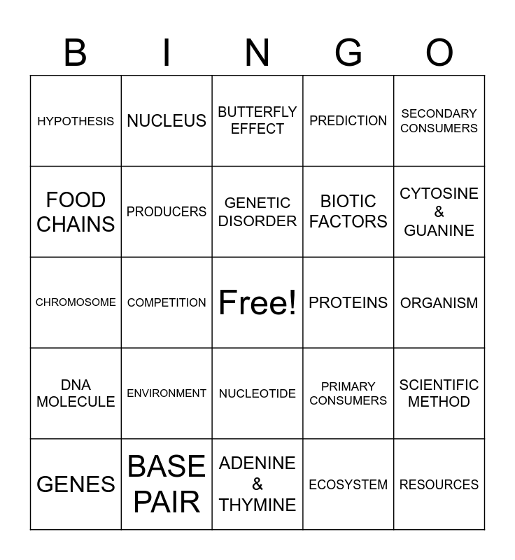 This bingo card has a free space and 28 words: SCIENTIFIC METHOD, ABIOTIC FACTORS, BIOTIC FACTORS, ECOSYSTEM, FOOD CHAINS, BUTTERFLY EFFECT, NUCLEUS, DNA MOLECULE, PROTEINS, GENES, CHROMOSOME, PREDICTION, BASE PAIR, ADENINE & THYMINE, CYTOSINE & GUANINE, MUTATION, ENVIRONMENT, PRODUCERS, GENETIC DISORDER, NUCLEOTIDE, HYPOTHESIS, HARMFUL /BENEFICIAL /NEUTRAL, RESOURCES, COMPETITION, ORGANISM, PRIMARY CONSUMERS, SECONDARY CONSUMERS and TERTIARY CONSUMERS.