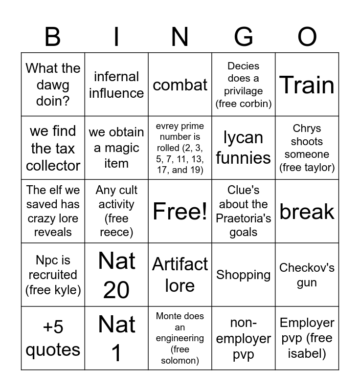 This bingo card has a free space and 24 words: Nat 20, Nat 1, evrey prime number is rolled (2, 3, 5, 7, 11, 13, 17, and 19), +5 quotes, Train, What the dawg doin?, we find the tax collector, infernal influence, Clue's about the Praetoria's goals, Artifact lore, lycan funnies, The elf we saved has crazy lore reveals, Shopping, Checkov's gun, we obtain a magic item, non-employer pvp, break, combat, Chrys shoots someone (free taylor), Any cult activity (free reece), Employer pvp (free isabel), Npc is recruited (free kyle), Decies does a privilage (free corbin) and Monte does an engineering (free solomon).