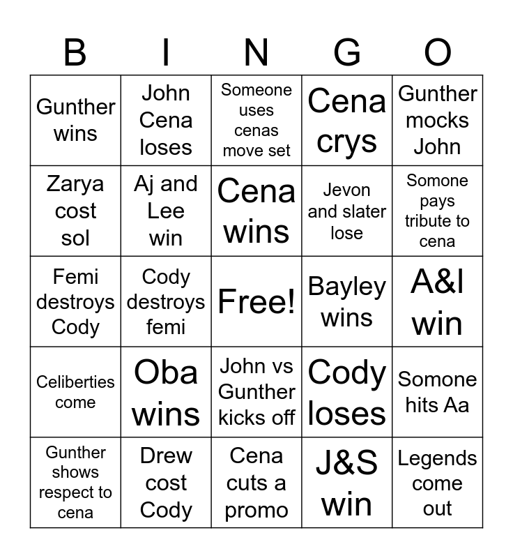 This bingo card has a free space and 24 words: Oba wins, Drew cost Cody, Cena wins, Gunther shows respect to cena, Gunther mocks John, Gunther wins, Zarya cost sol, John Cena loses, Bayley wins, John vs Gunther kicks off, Jevon and slater lose, Femi destroys Cody, Cody loses, Somone hits Aa, Aj and Lee win, J&S win, A&l win, Someone uses cenas move set, Somone pays tribute to cena, Cody destroys femi, Legends come out, Celiberties come, Cena crys and Cena cuts a promo.