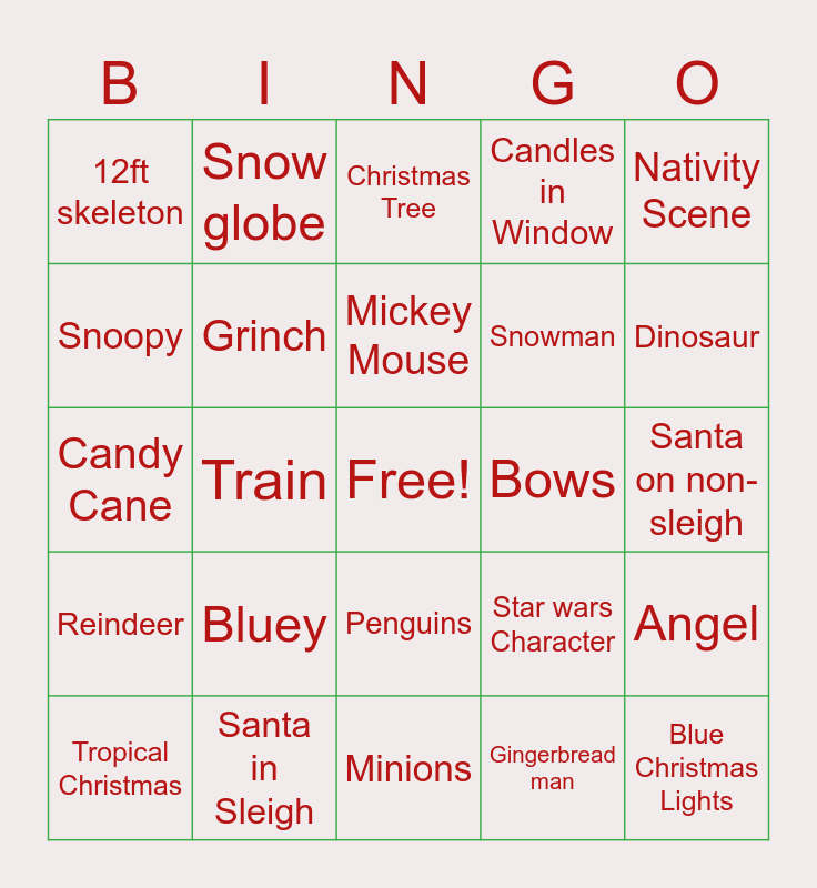 This bingo card has a free space and 24 words: Bluey, Santa in Sleigh, Mickey Mouse, Tropical Christmas, Nativity Scene, 12ft skeleton, Snoopy, Snow globe, Bows, Penguins, Snowman, Candy Cane, Star wars Character, Angel, Grinch, Gingerbread man, Santa on non-sleigh, Christmas Tree, Dinosaur, Train, Blue Christmas Lights, Reindeer, Candles in Window and Minions.