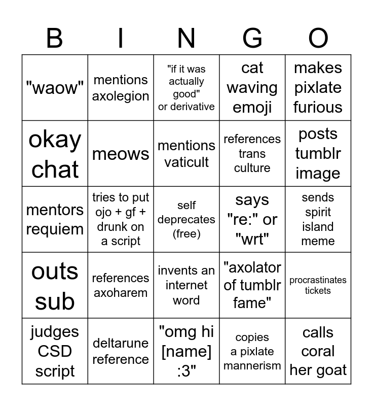 This bingo card has a free space and 24 words: references axoharem, deltarune reference, mentions vaticult, judges CSD script, makes pixlate furious, "waow", okay chat, mentions axolegion, says "re:" or "wrt", invents an internet word, references trans culture, mentors requiem, "axolator of tumblr fame", procrastinates tickets, meows, copies a pixlate mannerism, sends spirit island meme, "if it was actually good" or derivative, posts tumblr image, tries to put ojo + gf + drunk on a script, calls coral her goat, outs sub, cat waving emoji and "omg hi [name] :3".
