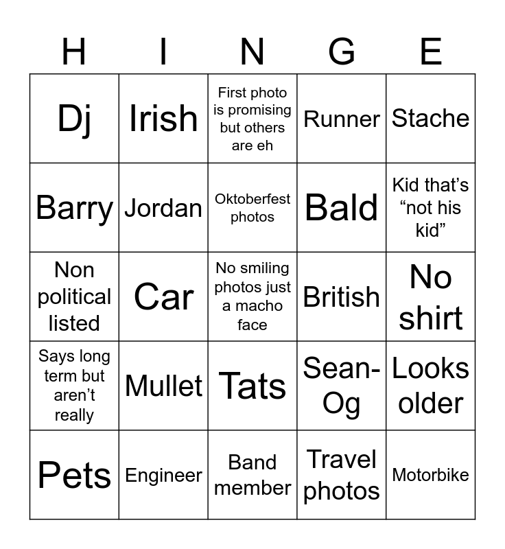 This bingo card has a free space and 24 words: Mullet, Engineer, Oktoberfest photos, Pets, Stache, Dj, Barry, Irish, British, Tats, Bald, Non political listed, Sean-Og, Looks older, Jordan, Travel photos, No shirt, First photo is promising but others are eh, Kid that’s “not his kid”, Car, Motorbike, Says long term but aren’t really, Runner and Band member.