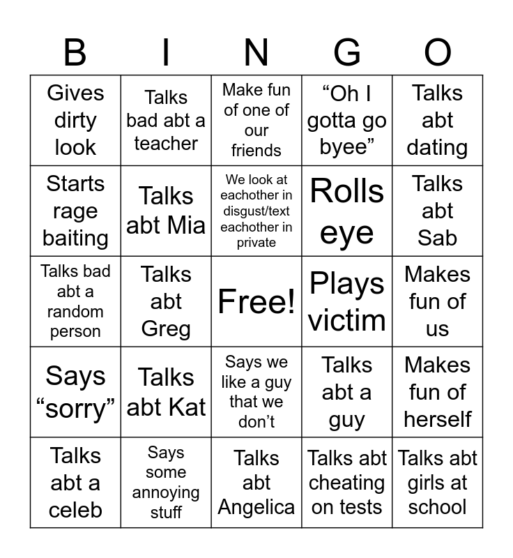 This bingo card has a free space and 24 words: Talks abt Kat, Says some annoying stuff, We look at eachother in disgust/text eachother in private, Talks abt a celeb, Talks abt dating, Gives dirty look, Starts rage baiting, Talks bad abt a teacher, Plays victim, Says we like a guy that we don’t, Rolls eye, Talks bad abt a random person, Talks abt a guy, Makes fun of herself, Talks abt Mia, Talks abt cheating on tests, Makes fun of us, Make fun of one of our friends, Talks abt Sab, Talks abt Greg, Talks abt girls at school, Says “sorry”, “Oh I gotta go byee” and Talks abt Angelica.