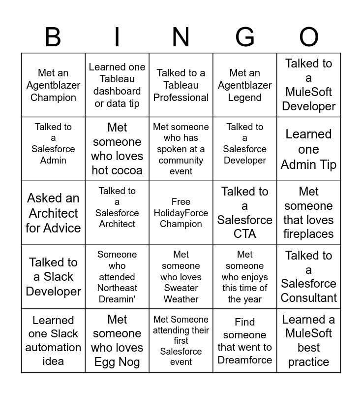 This bingo card has a free space and 24 words: Someone who attended Northeast Dreamin', Met someone who loves Egg Nog, Met someone who has spoken at a community event, Learned one Slack automation idea, Talked to a MuleSoft Developer, Met an Agentblazer Champion, Talked to a Salesforce Admin, Learned one Tableau dashboard or data tip, Talked to a Salesforce CTA, Met someone who loves Sweater Weather, Talked to a Salesforce Developer, Asked an Architect for Advice, Met someone who enjoys this time of the year, Talked to a Salesforce Consultant, Met someone who loves hot cocoa, Find someone that went to Dreamforce, Met someone that loves fireplaces, Talked to a Tableau Professional, Learned one Admin Tip, Talked to a Salesforce Architect, Learned a MuleSoft best practice, Talked to a Slack Developer, Met an Agentblazer Legend and Met Someone attending their first Salesforce event.
