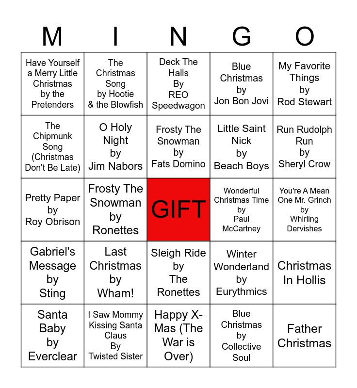 This bingo card has a free space and 44 words: CHRISTMAS TIME, Father Christmas, Another Rock and Roll Christmas, Santa Baby by Everclear, Three Ships by Cyndi Lauper, Blue Christmas by Collective Soul, Deck The Halls By REO Speedwagon, It's Christmas Time by Melissa Etheridge, My Favorite Things by Rod Stewart, I Saw Mommy Kissing Santa Claus By Twisted Sister, Blue Christmas by Jon Bon Jovi, Wonderful Christmas Time by Paul McCartney, Sleigh Ride by The Ronettes, Last Christmas by Wham!, Santa Claus Is Coming to Town by Bruce Springsteen, Happy X-Mas (The War is Over), Christmas Wrapping, Pretty Paper by Roy Obrison, Silent Night by Stevie Nicks, Run Rudolph Run by Sheryl Crow, The Christmas Song by Hootie & the Blowfish, Rockin' Around The Christmas Tree by Ronnie Spector, The Little Drummer Boy by Bob Seger, Have Yourself a Merry Little Christmas by the Pretenders, Mr. Heatmiser by Big Bad Voodoo Daddy, You're A Mean One Mr. Grinch by Whirling Dervishes, Jolly Old St. Nicholas by Chicago, We Three Kings by Fuel, Winter Wonderland by Eurythmics, Gabriel's Message by Sting, Peace On Earth / Little Drummer Boy Bing Crosby & David Bowie, Christmas In Hollis, I Have a Little Dreidel by Barenaked Ladies, Fairytale Of New York, Frosty The Snowman by Ronettes, All Alone On Christmas, The Man With All The Toys by Beach Boys, Have Yourself A Merry Little Christmas Jonny Maestro, Frosty The Snowman by Fats Domino, The Chipmunk Song (Christmas Don't Be Late), Little Saint Nick by Beach Boys, Monsters' Holiday By Bobby Boris Pickett, O Holy Night by Jim Nabors and Reggae Christmas by Bryan Adams.