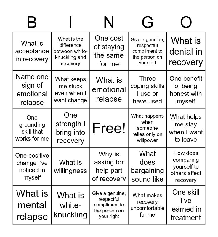 This bingo card has a free space and 24 words: What is willingness, What is white-knuckling, What is emotional relapse, What is mental relapse, What is denial in recovery, What is acceptance in recovery, Name one sign of emotional relapse, What is the difference between white-knuckling and recovery, What happens when someone relies only on willpower, Why is asking for help part of recovery, Three coping skills I use or have used, One grounding skill that works for me, What does bargaining sound like, How does comparing yourself to others affect recovery, What keeps me stuck even when I want change, What makes recovery uncomfortable for me, What helps me stay when I want to leave, One cost of staying the same for me, One benefit of being honest with myself, One strength I bring into recovery, One skill I’ve learned in treatment, One positive change I’ve noticed in myself, Give a genuine, respectful compliment to the person on your left and Give a genuine, respectful compliment to the person on your right.