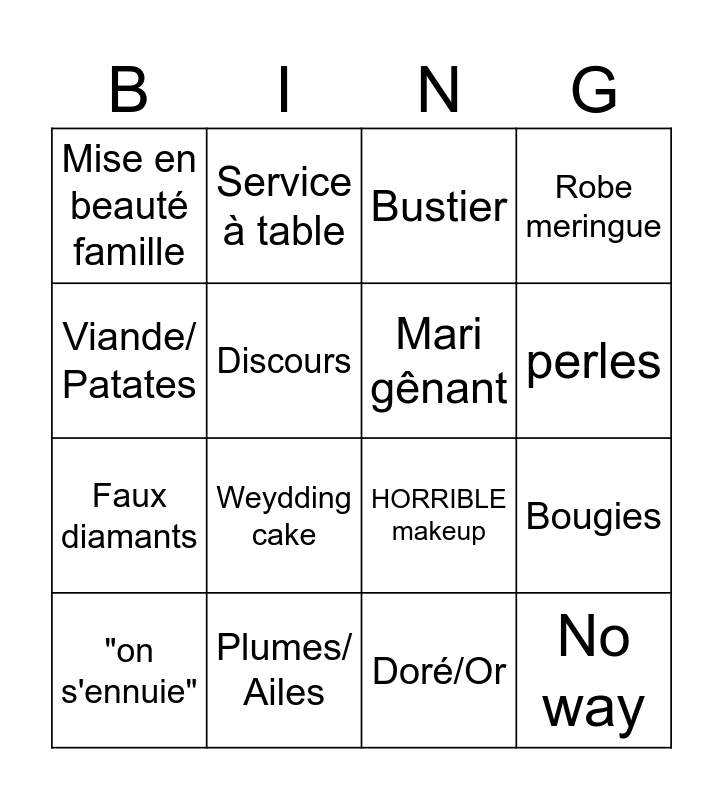 This bingo card has 16 words: Plumes/ Ailes, Bougies, Bustier, Mise en beauté famille, Faux diamants, Service à table, HORRIBLE makeup, Doré/Or, Viande/ Patates, Discours, "on s'ennuie", Robe meringue, Weydding cake, perles, Mari gênant and No way.