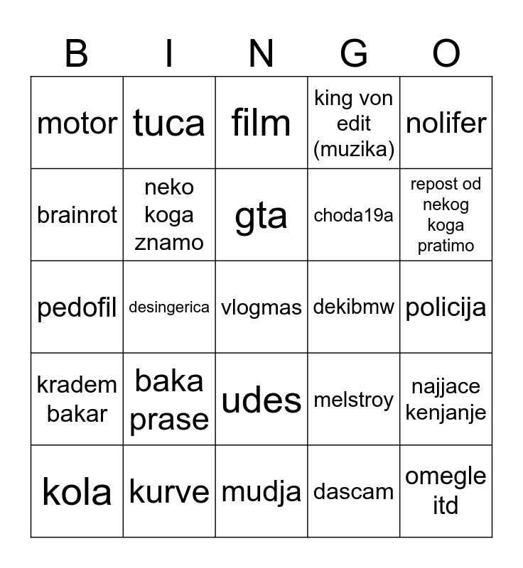 This bingo card has a free space and 24 words: baka prase, kurve, gta, kola, nolifer, motor, brainrot, tuca, dekibmw, udes, choda19a, pedofil, melstroy, najjace kenjanje, neko koga znamo, dascam, policija, film, repost od nekog koga pratimo, desingerica, omegle itd, kradem bakar, king von edit (muzika) and mudja.