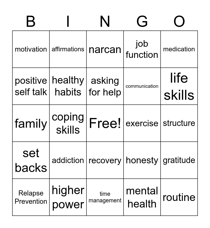 This bingo card has a free space and 29 words: Relapse Prevention, stability, coping skills, therapy, motivation, narcan, healthy habits, addiction, exercise, higher power, structure, routine, time management, mental health, life skills, sobriety, recovery, set backs, medication, family, honesty, healthy relationships, communication, positive self talk, job function, affirmations, gratitude, asking for help and sponsor.