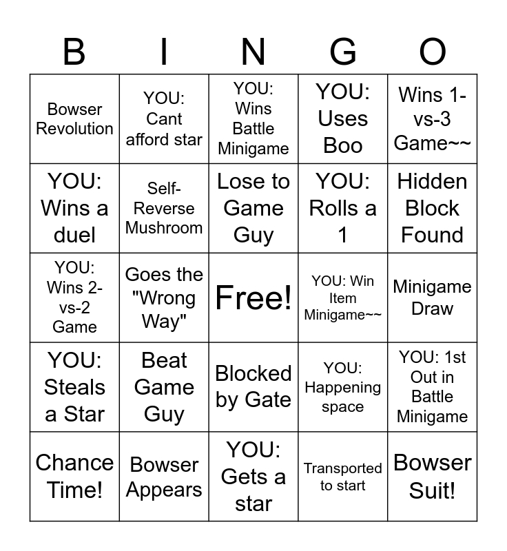This bingo card has a free space and 27 words: YOU: Happening space, YOU: Rolls a 10, YOU: Rolls a 1, YOU: Gets a star, YOU: Wins a duel, YOU: Wins Battle Minigame, YOU: Cant afford star, YOU: Steals a Star, YOU: Win Item Minigame~~, YOU: 1st Out in Battle Minigame, YOU: Wins 2-vs-2 Game, YOU: Uses Boo, Chance Time!, Bowser Appears, Hidden Block Found, Rolls Doubles, Self-Reverse Mushroom, Lose to Game Guy, Beat Game Guy, Bowser Revolution, Minigame Draw, Transported to start, Goes the "Wrong Way", Bowser Suit!, Blocked by Gate, Wins 1-vs-3 Game~~ and Bank Space~~.