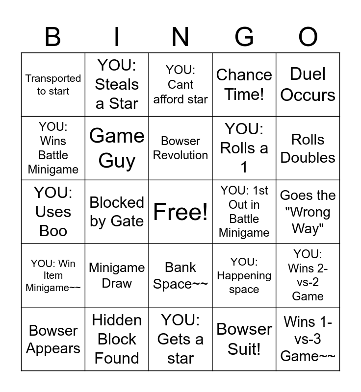 This bingo card has a free space and 27 words: YOU: Happening space, YOU: Rolls a 10, YOU: Rolls a 1, YOU: Gets a star, YOU: Wins Battle Minigame, YOU: Cant afford star, YOU: Steals a Star, YOU: Win Item Minigame~~, YOU: 1st Out in Battle Minigame, YOU: Wins 2-vs-2 Game, YOU: Uses Boo, Chance Time!, Bowser Appears, Hidden Block Found, Rolls Doubles, Self-Reverse Mushroom, Game Guy, Bowser Revolution, Minigame Draw, Transported to start, Goes the "Wrong Way", Bowser Suit!, Blocked by Gate, Wins 1-vs-3 Game~~, Bank Space~~, Duel Occurs and Loses a star.