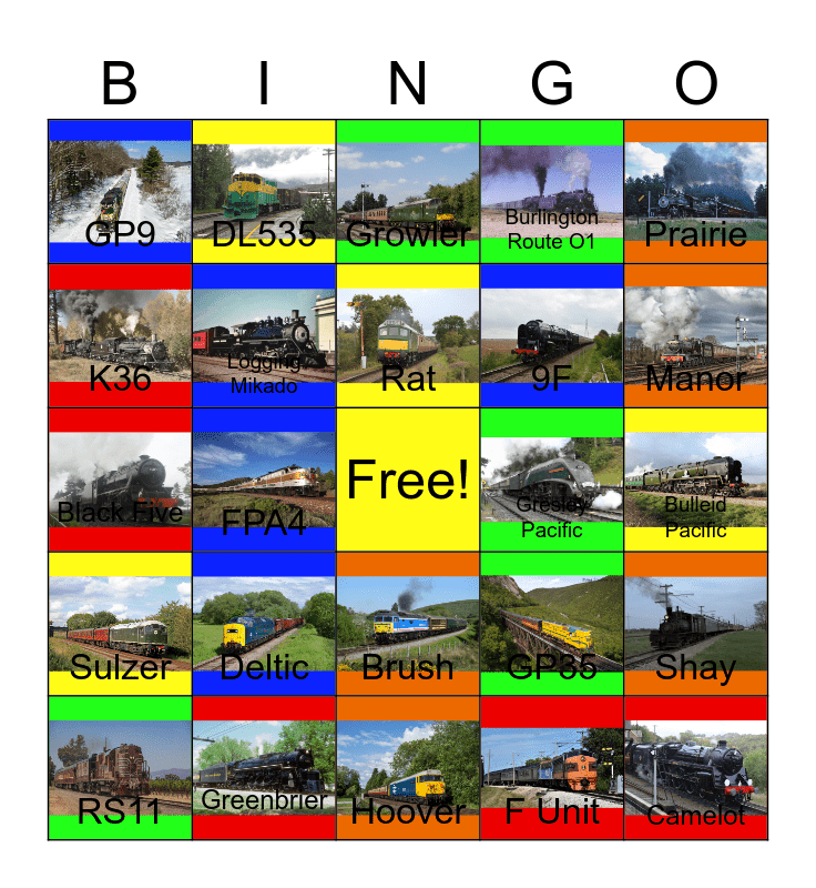 This bingo card has 24 images, a free space and 24 words: Deltic, Greenbrier, Rat, RS11, Prairie, GP9, K36, DL535, Gresley Pacific, Brush, 9F, Black Five, GP35, Shay, Logging Mikado, F Unit, Bulleid Pacific, Growler, Manor, FPA4, Camelot, Sulzer, Burlington Route O1 and Hoover.