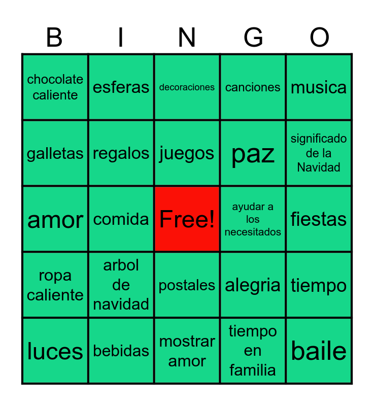 This bingo card has a free space and 24 words: arbol de navidad, bebidas, juegos, luces, musica, chocolate caliente, galletas, esferas, ayudar a los necesitados, postales, paz, amor, alegria, tiempo, regalos, tiempo en familia, fiestas, decoraciones, significado de la Navidad, comida, baile, ropa caliente, canciones and mostrar amor.