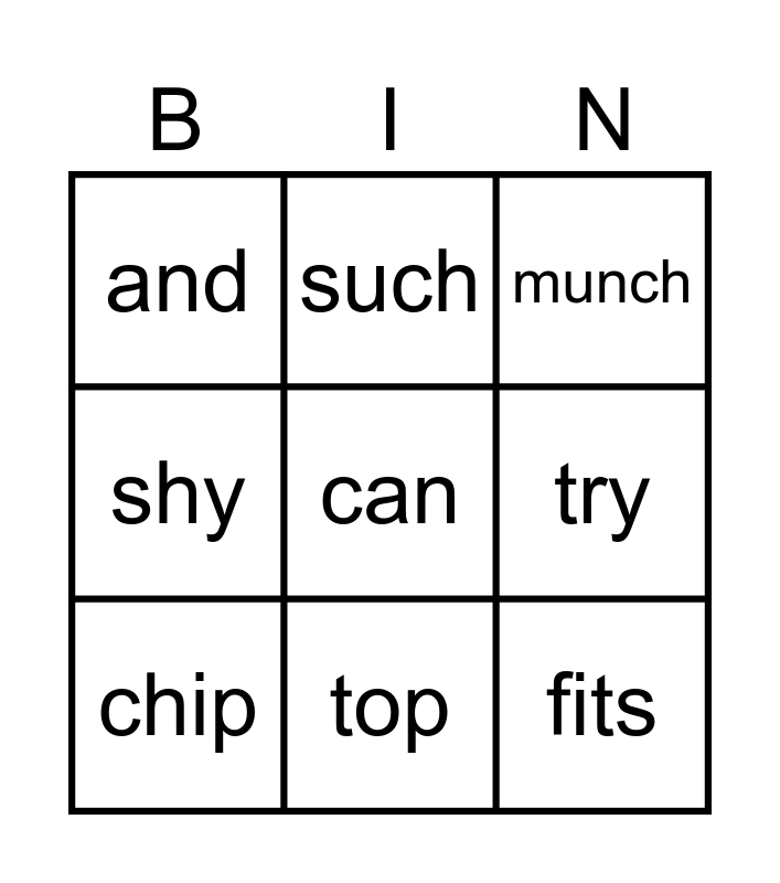 This bingo card has a free space and 20 words: has, chin, try, bench, fish, shy, she, munch, my, such, rich, much, top, big, chip, shut, fits, and, ship and it.