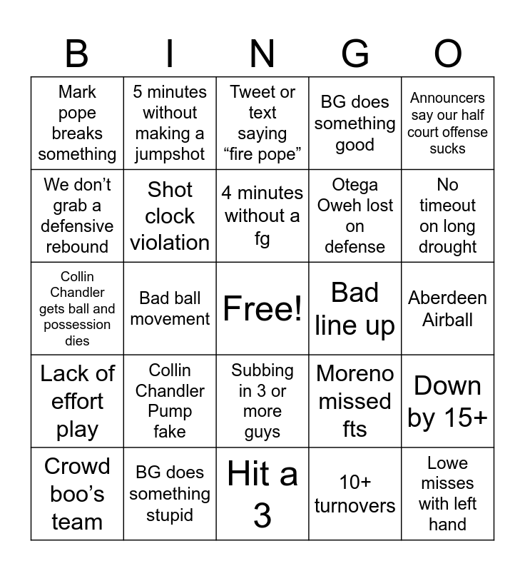 This bingo card has a free space and 24 words: Collin Chandler Pump fake, BG does something stupid, 4 minutes without a fg, Crowd boo’s team, Announcers say our half court offense sucks, Mark pope breaks something, We don’t grab a defensive rebound, 5 minutes without making a jumpshot, Bad line up, Subbing in 3 or more guys, Otega Oweh lost on defense, Collin Chandler gets ball and possession dies, Moreno missed fts, Down by 15+, Shot clock violation, 10+ turnovers, Aberdeen Airball, Tweet or text saying “fire pope”, No timeout on long drought, Bad ball movement, Lowe misses with left hand, Lack of effort play, BG does something good and Hit a 3.