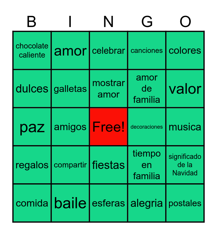 This bingo card has a free space and 34 words: arbol de navidad, bebidas, juegos, luces, musica, dulces, galletas, esferas, amor de familia, postales, paz, amor, alegria, tiempo, regalos, amigos, fiestas, decoraciones, significado de la Navidad, comida, baile, tradiciones, canciones, valor, villancicos, compartir, celebrar, cantar, colores, chocolate caliente, ropa caliente, mostrar amor, tiempo en familia and ayudar a los necesitados.