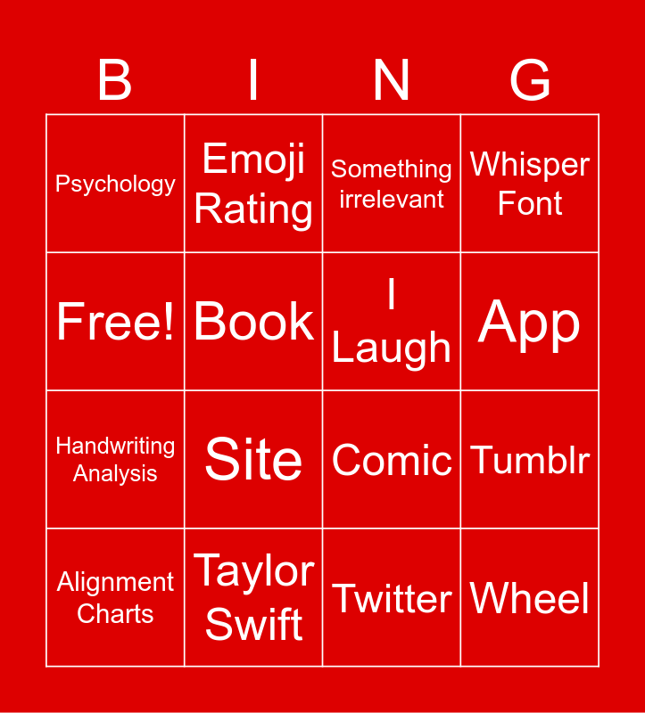 This bingo card has 16 words: Taylor Swift, Tumblr, Something irrelevant, Psychology, Handwriting Analysis, Emoji Rating, Comic, Twitter, Free!, Book, Alignment Charts, Whisper Font, Site, App, I Laugh and Wheel.