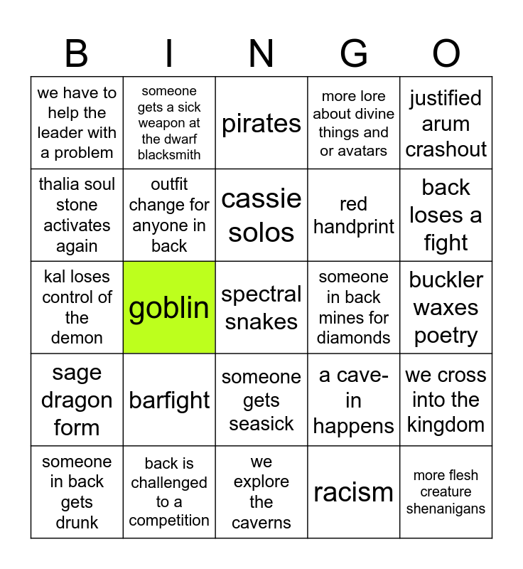 This bingo card has a free space and 24 words: barfight, back is challenged to a competition, cassie solos, someone in back gets drunk, justified arum crashout, we have to help the leader with a problem, thalia soul stone activates again, someone gets a sick weapon at the dwarf blacksmith, someone in back mines for diamonds, someone gets seasick, red handprint, kal loses control of the demon, a cave-in happens, we cross into the kingdom, outfit change for anyone in back, racism, buckler waxes poetry, pirates, back loses a fight, goblin, more flesh creature shenanigans, sage dragon form, more lore about divine things and or avatars and we explore the caverns.