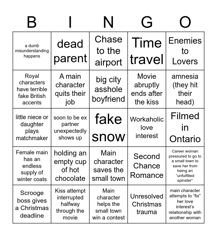 This bingo card has a free space and 28 words: Career woman pressured to go to a small town to save her from being an “unfulfilled spinster”, love interest is a Christmas mascot, Movie abruptly ends after the kiss, Unresolved Christmas trauma, Royal characters have terrible fake British accents, Chase to the airport, dead parent, Female main has an endless supply of winter coats, Workaholic love interest, Scrooge boss gives a Christmas deadline, little niece or daughter plays matchmaker, Time travel, Kiss attempt interrupted halfway through the movie, Main character helps the small town win a contest, amnesia (they hit their head), A public proclamation of love, holding an empty cup of hot chocolate, A main character quits their job, big city asshole boyfriend, Main character saves the small town, a dumb misunderstanding happens, Main character has some niche Christmas job, main character attempts to “fix” her love interest’s relationship with another woman, soon to be ex partner unexpectedly shows up, Filmed in Ontario, Second Chance Romance, Enemies to Lovers and Precocious child.
