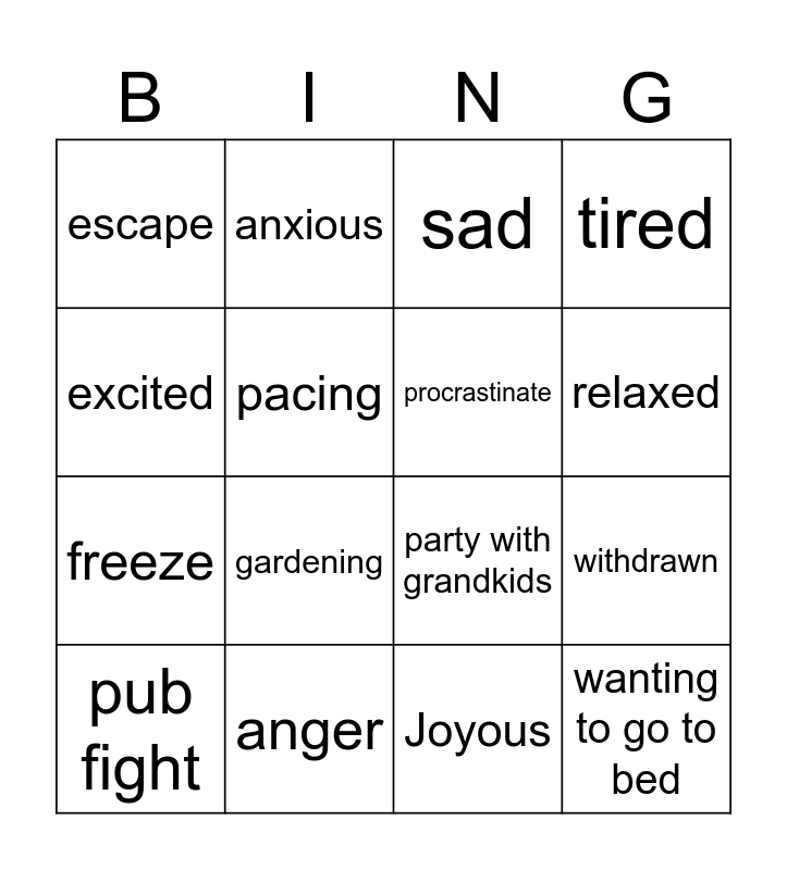 This bingo card has 16 words: anger, withdrawn, sad, escape, freeze, anxious, party with grandkids, Joyous, excited, pacing, pub fight, tired, gardening, relaxed, procrastinate and wanting to go to bed.