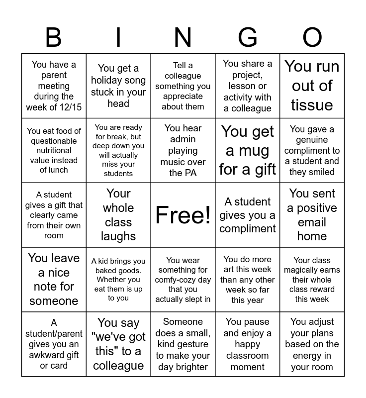This bingo card has a free space and 25 words: A kid brings you baked goods. Whether you eat them is up to you, Someone does a small, kind gesture to make your day brighter, You hear admin playing music over the PA, A student/parent gives you an awkward gift or card, You run out of tissue, You have a parent meeting during the week of 12/15, You eat food of questionable nutritional value instead of lunch, You get a holiday song stuck in your head, A student gives you a compliment, You wear something for comfy-cozy day that you actually slept in, You get a mug for a gift, A student gives a gift that clearly came from their own room, You do more art this week than any other week so far this year, Your class magically earns their whole class reward this week, You are ready for break, but deep down you will actually miss your students, A student asks a question that has already been answered, You sent a positive email home, Tell a colleague something you appreciate about them, You gave a genuine compliment to a student and they smiled, Your whole class laughs, You adjust your plans based on the energy in your room, You say "we've got this" to a colleague, You leave a nice note for someone, You share a project, lesson or activity with a colleague and You pause and enjoy a happy classroom moment.