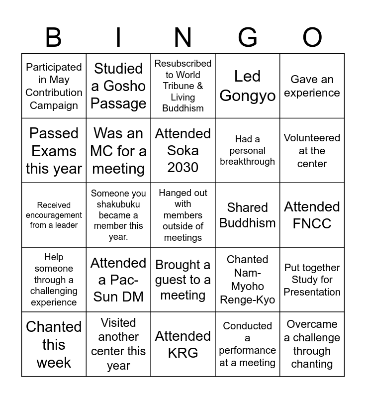 This bingo card has 25 words: Attended a Pac-Sun DM, Attended KRG, Attended Soka 2030, Chanted this week, Gave an experience, Participated in May Contribution Campaign, Passed Exams this year, Studied a Gosho Passage, Shared Buddhism, Brought a guest to a meeting, Had a personal breakthrough, Received encouragement from a leader, Chanted Nam-Myoho Renge-Kyo, Put together Study for Presentation, Was an MC for a meeting, Overcame a challenge through chanting, Attended FNCC, Resubscribed to World Tribune & Living Buddhism, Volunteered at the center, Someone you shakubuku became a member this year., Hanged out with members outside of meetings, Visited another center this year, Help someone through a challenging experience, Led Gongyo and Conducted a performance at a meeting.