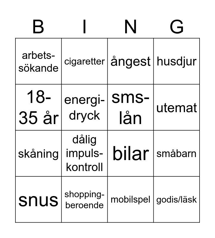 This bingo card has 16 words: shopping-beroende, småbarn, ångest, arbets-sökande, skåning, cigaretter, bilar, mobilspel, 18-35 år, energi-dryck, snus, husdjur, dålig impuls-kontroll, utemat, sms-lån and godis/läsk.