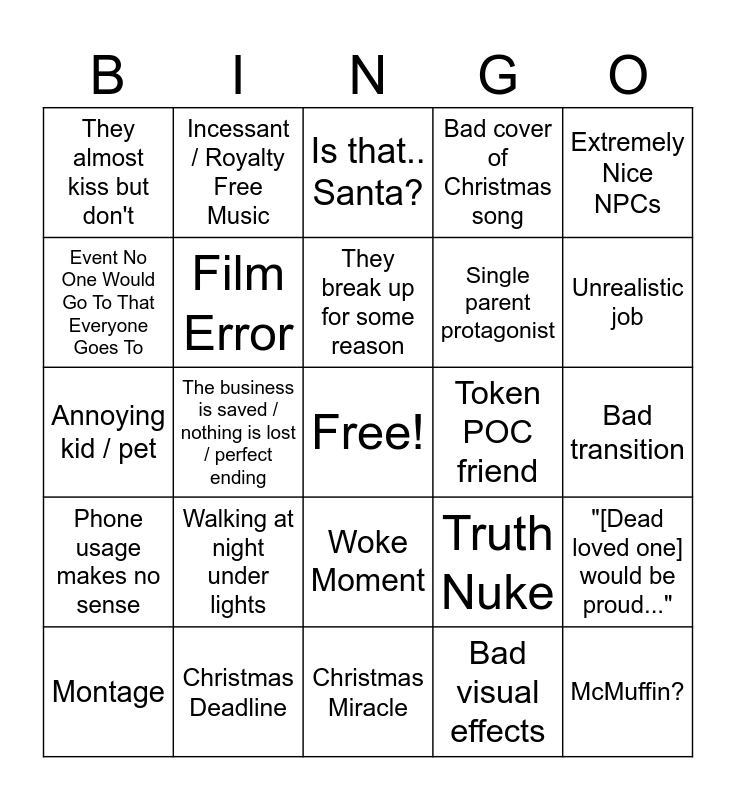 This bingo card has a free space and 24 words: Walking at night under lights, Christmas Deadline, They break up for some reason, Montage, Extremely Nice NPCs, They almost kiss but don't, Event No One Would Go To That Everyone Goes To, Incessant / Royalty Free Music, Token POC friend, Woke Moment, Single parent protagonist, Annoying kid / pet, Truth Nuke, "[Dead loved one] would be proud...", Film Error, Bad visual effects, Bad transition, Is that.. Santa?, Unrealistic job, The business is saved / nothing is lost / perfect ending, McMuffin?, Phone usage makes no sense, Bad cover of Christmas song and Christmas Miracle.