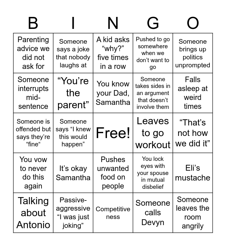 This bingo card has a free space and 24 words: It’s okay Samantha, Passive-aggressive “I was just joking”, You know your Dad, Samantha, Talking about Antonio, Someone brings up politics unprompted, Parenting advice we did not ask for, Someone interrupts mid-sentence, Someone says a joke that nobody laughs at, Leaves to go workout, Pushes unwanted food on people, Someone takes sides in an argument that doesn’t involve them, Someone is offended but says they’re “fine“, You lock eyes with your spouse in mutual disbelief, Eli’s mustache, “You’re the parent”, Someone calls Devyn, “That’s not how we did it”, A kid asks “why?” five times in a row, Falls asleep at weird times, Someone says “I knew this would happen”, Someone leaves the room angrily, You vow to never do this again, Pushed to go somewhere when we don’t want to go and Competitive ness.