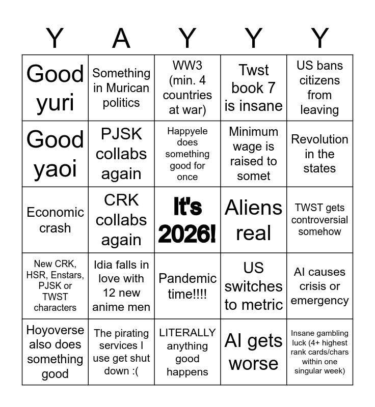This bingo card has a free space and 25 words: Idia falls in love with 12 new anime men, LITERALLY anything good happens, Happyele does something good for once, Hoyoverse also does something good, US bans citizens from leaving, Good yuri, Good yaoi, Something in Murican politics, Aliens real, Pandemic time!!!!, Minimum wage is raised to somet, Economic crash, US switches to metric, AI causes crisis or emergency, PJSK collabs again, Halloween is really trashy (again), TWST gets controversial somehow, WW3 (min. 4 countries at war), Revolution in the states, CRK collabs again, Insane gambling luck (4+ highest rank cards/chars within one singular week), The pirating services I use get shut down :(, New CRK, HSR, Enstars, PJSK or TWST characters, Twst book 7 is insane and AI gets worse.