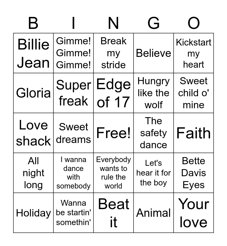 This bingo card has a free space and 42 words: Material Girl, Edge of 17, Everywhere, I wanna dance with somebody, Animal, Bette Davis Eyes, Your love, Bennie & the Jets, Break my stride, Everybody wants to rule the world, Faith, Sweet child o' mine, Sweet dreams, Kickstart my heart, Dancing in the sheets, Let's hear it for the boy, Video killed the radio star, Love shack, You can call me Al, Gimme! Gimme! Gimme!, Gloria, Easy Lover, Manic Monday, Billie Jean, Need you tonight, Karma chameleon, Hungry like the wolf, Get outta my dreams, Another one bites the dust, Every breath you take, Take my breath away, All night long, Super freak, Beat it, Flashdance, Holiday, Wanna be startin' somethin', The safety dance, Electric avenue, Black or white, Believe and Come on Eileen.