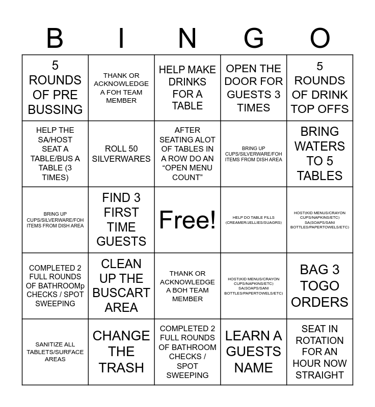 This bingo card has a free space and 24 words: CLEAN UP THE BUSCART AREA, CHANGE THE TRASH, AFTER SEATING ALOT OF TABLES IN A ROW DO AN “OPEN MENU COUNT”, SANITIZE ALL TABLETS/SURFACE AREAS, 5 ROUNDS OF DRINK TOP OFFS, 5 ROUNDS OF PRE BUSSING, HELP THE SA/HOST SEAT A TABLE/BUS A TABLE (3 TIMES), THANK OR ACKNOWLEDGE A FOH TEAM MEMBER, HELP DO TABLE FILLS (CREAMER/JELLIES/SUAGRS), THANK OR ACKNOWLEDGE A BOH TEAM MEMBER, BRING UP CUPS/SILVERWARE/FOH ITEMS FROM DISH AREA, BRING UP CUPS/SILVERWARE/FOH ITEMS FROM DISH AREA, HOST(KID MENUS/CRAYON CUPS/NAPKINS/ETC) SA(SOAPS/SANI BOTTLES/PAPERTOWELS/ETC), BAG 3 TOGO ORDERS, ROLL 50 SILVERWARES, LEARN A GUESTS NAME, HOST(KID MENUS/CRAYON CUPS/NAPKINS/ETC) SA(SOAPS/SANI BOTTLES/PAPERTOWELS/ETC), HELP MAKE DRINKS FOR A TABLE, BRING WATERS TO 5 TABLES, FIND 3 FIRST TIME GUESTS, SEAT IN ROTATION FOR AN HOUR NOW STRAIGHT, COMPLETED 2 FULL ROUNDS OF BATHROOMp CHECKS / SPOT SWEEPING, OPEN THE DOOR FOR GUESTS 3 TIMES and COMPLETED 2 FULL ROUNDS OF BATHROOM CHECKS / SPOT SWEEPING.