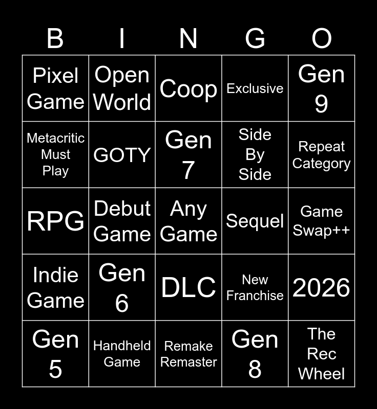 This bingo card has a free space and 24 words: Gen 5, Gen 6, Gen 7, Gen 8, Gen 9, Pixel Game, Open World, Coop, Sequel, Game Swap++, RPG, GOTY, New Franchise, 2026, Metacritic Must Play, Handheld Game, Remake Remaster, Exclusive, Repeat Category, Indie Game, Debut Game, DLC, Side By Side and The Rec Wheel.