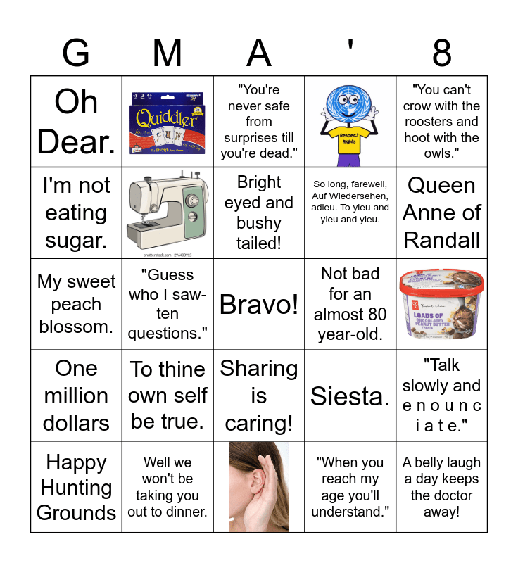 This bingo card has 11 images, a free space and 28 words: My sweet cherry blossom, "Plate filler, Plate filler...", Happy Hunting Grounds, Sharing is caring!, Bright eyed and bushy tailed!, Be an upstander., "You can't crow with the roosters and hoot with the owls.", One million dollars, "Guess who I saw- ten questions.", A belly laugh a day keeps the doctor away!, Not bad for an almost 80 year-old., To thine own self be true., You're my favourite grandchild., Oh Dear., We will be there, with bells on!, Siesta., I'm not eating sugar., So long, farewell, Auf Wiedersehen, adieu. To yieu and yieu and yieu., Queen Anne of Randall, Caring is sharing!, Your cheque is in the mail., Uncouth., One square of dark chocolate a day., "You're never safe from surprises till you're dead.", Well we won't be taking you out to dinner., "When you reach my age you'll understand.", "Talk slowly and e n o u n c i a t e." and My sweet peach blossom..