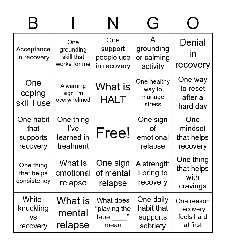 This bingo card has a free space and 24 words: What is emotional relapse, What is mental relapse, What is HALT, White-knuckling vs recovery, Denial in recovery, Acceptance in recovery, One coping skill I use, One grounding skill that works for me, One sign of emotional relapse, One sign of mental relapse, One healthy way to manage stress, One habit that supports recovery, A strength I bring to recovery, One thing that helps with cravings, A warning sign I’m overwhelmed, One daily habit that supports sobriety, One mindset that helps recovery, One support people use in recovery, One way to reset after a hard day, One thing I’ve learned in treatment, One reason recovery feels hard at first, One thing that helps consistency, A grounding or calming activity and What does “playing the tape ____” mean.