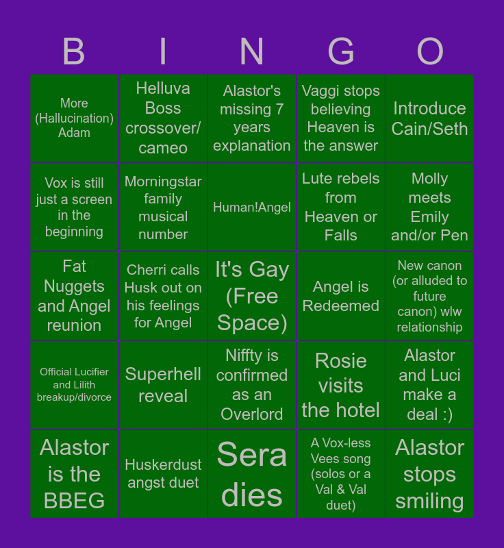 This bingo card has a free space and 24 words: Superhell reveal, Huskerdust angst duet, Human!Angel, Alastor is the BBEG, Introduce Cain/Seth, More (Hallucination) Adam, Vox is still just a screen in the beginning, Helluva Boss crossover/ cameo, Angel is Redeemed, Niffty is confirmed as an Overlord, Lute rebels from Heaven or Falls, Fat Nuggets and Angel reunion, Rosie visits the hotel, Alastor and Luci make a deal :), Morningstar family musical number, A Vox-less Vees song (solos or a Val & Val duet), New canon (or alluded to future canon) wlw relationship, Alastor's missing 7 years explanation, Molly meets Emily and/or Pen, Cherri calls Husk out on his feelings for Angel, Alastor stops smiling, Official Lucifier and Lilith breakup/divorce, Vaggi stops believing Heaven is the answer and Sera dies.