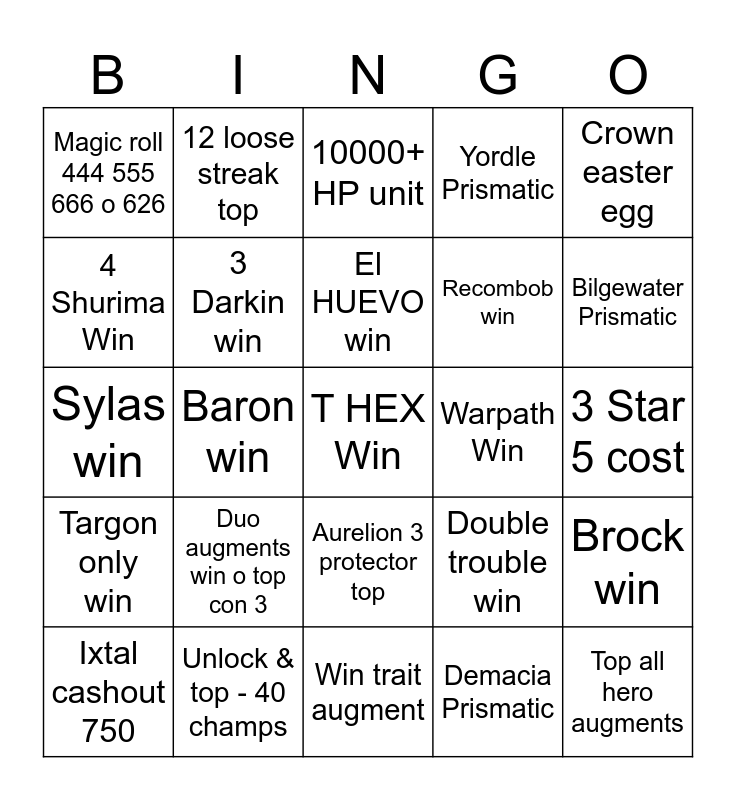 This bingo card has 25 words: Duo augments win o top con 3, Win trait augment, El HUEVO win, Ixtal cashout 750, Crown easter egg, Magic roll 444 555 666 o 626, 4 Shurima Win, 12 loose streak top, Warpath Win, Aurelion 3 protector top, Recombob win, Sylas win, Double trouble win, Brock win, 3 Darkin win, Top all hero augments, 3 Star 5 cost, 10000+ HP unit, Bilgewater Prismatic, Baron win, T HEX Win, Unlock & top - 40 champs, Targon only win, Yordle Prismatic and Demacia Prismatic.