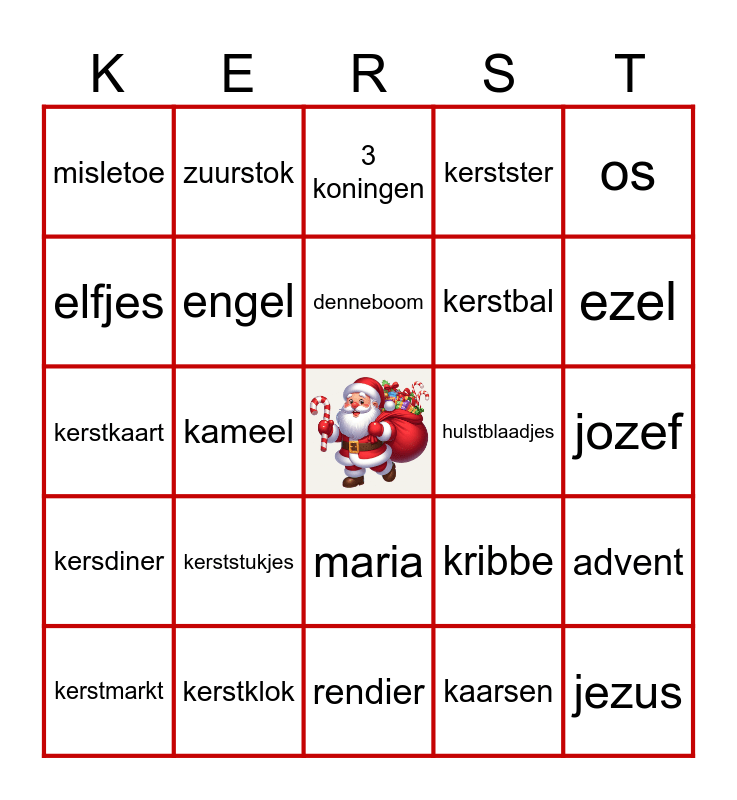 This bingo card has a free space and 42 words: kerstkilo's, denneboom, slingers, kerststukjes, kaarsen, advent, jezus, kerststal, 3 koningen, maria, jozef, ezel, kameel, os, schaapsherder, kribbe, 3 wijzen, kerstkaart, kerstpostzegel, zuurstok, elfjes, gemberkoek, kerstsok, misletoe, versiering, kerstman, kerstbal, kerstmis, kerstboom, lichtjes, piek, kersdiner, engel, rendier, arreslee, kerstmarkt, kerstklok, hulstblaadjes, kerstkrans, cadeautjes, kerstster and kerstshow.